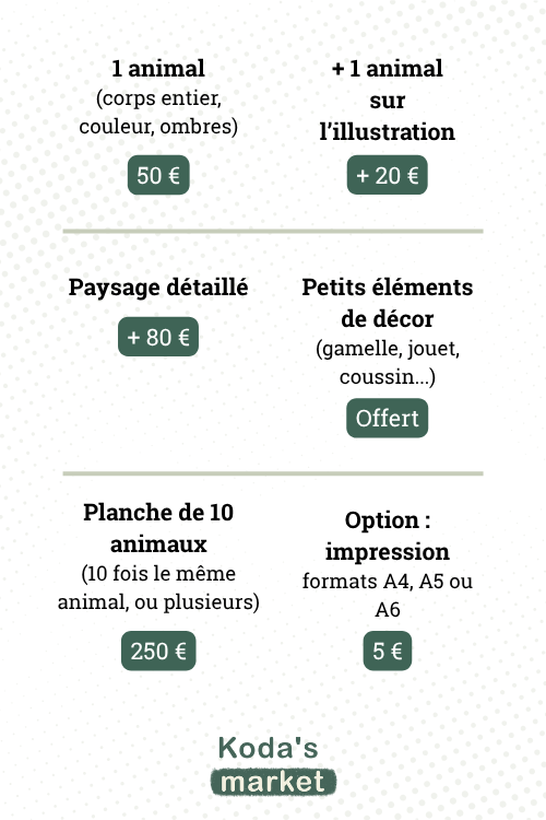 Si vous n’avez pas reçu de réponse à votre de demande de devis sous une semaine, envoyez-moi un petit message (sur Instagram, Facebook ou à kodasmarket.shop@ gmail.com).